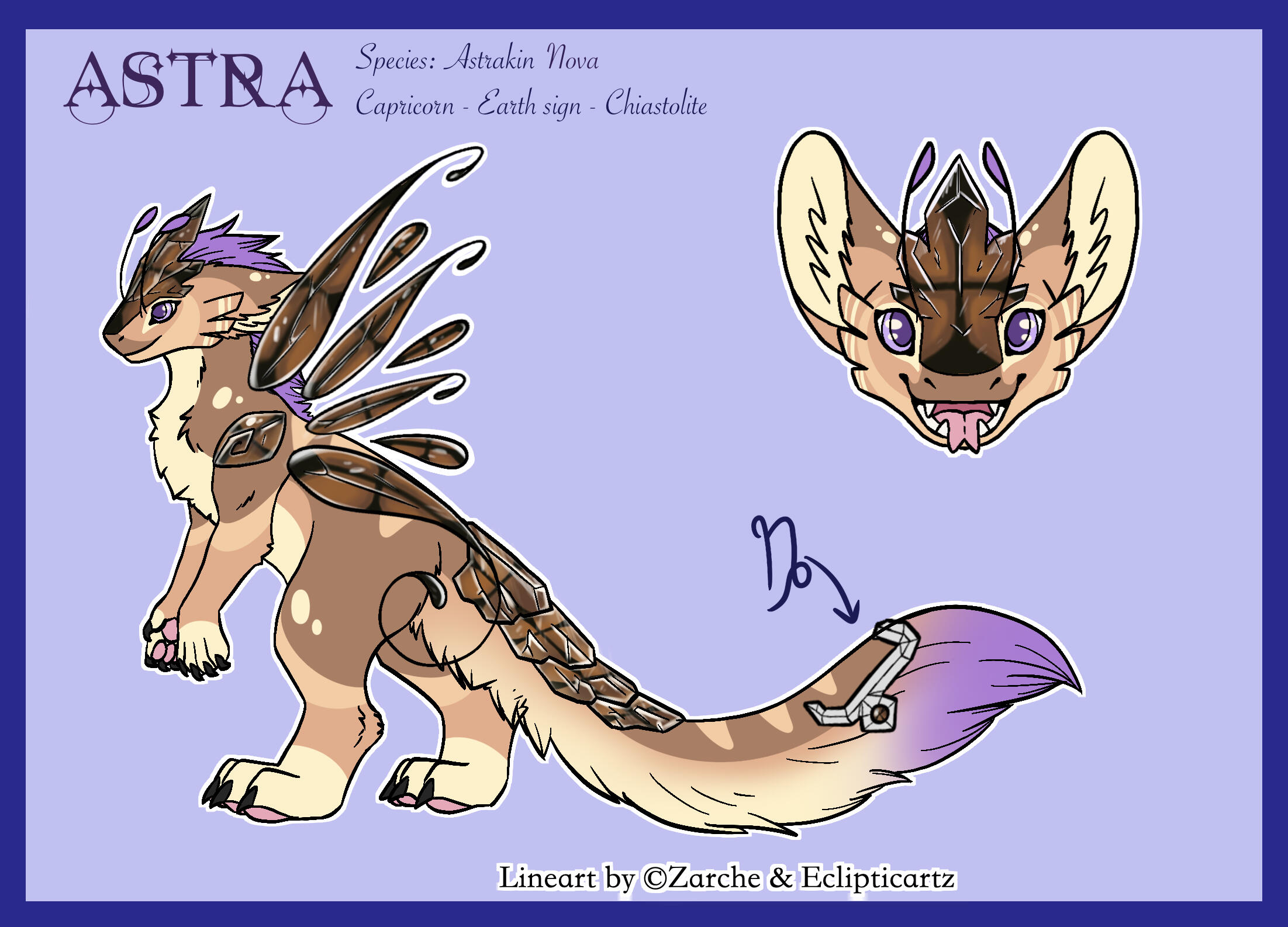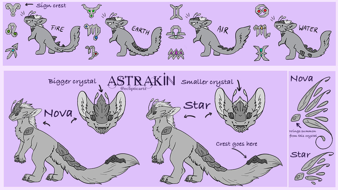 - Nova’s can’t be made. You can only acquire one from a open slot from Eclipticarz or bought as adopted only by Eclipticartz or Zarche_draws.- You may choose your own crystal, but it’s encouraged to choose one of the crystals of your zodiac crystal chart. The Crystal you choose must match their class and power listed.- The crystal you choose is the color/sort of crystal you use for your head, shoulder and tail crystal. Also the Crystal gemstone in the crest is the same as your chosen Crystal.- Only one power can be owned by a Star Astrakin, listed with their sign and crystal.- Crest can't be removed form tail. They show which sign your Astrakin belongs to.- Your Astrakin must match the lore.- You can't mix and match a class and crystal. Their power & class are matched with one crystal per sign already, listed on the create your astrakin page.- While it's okay to give your own creative spin to your Astrakin, try to create them within the spirit of the species' lore and themes.- If you are not sure if something is allowed or something is confusing, message Eclipticartz for Questions!